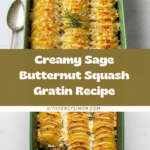 Keywords: butternut squash gratin, sage gratin, creamy squash casserole, baked squash recipe, vegetarian side dish