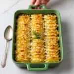 The image shows a rectangular green baking dish filled with a layered potato gratin. Thin slices of golden-brown potatoes are neatly arranged in overlapping rows, slightly lifting to reveal a creamy, cheesy sauce bubbling underneath. The surface is topped with fresh herbs, likely rosemary, adding a touch of green. A large silver spoon rests in the bottom corner of the dish, with a woman's hand holding it, ready to serve. The baking dish is placed on a white marbled surface. Photo taken with an iphone --ar 4:5 --v 7