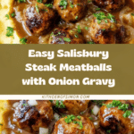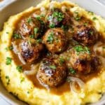 Salisbury Steak Meatballs with Rich Onion Gravy bring classic comfort food into a convenient, bite-sized form. These juicy meatballs are coated in a savory onion gravy that makes every bite deliciously satisfying and perfect for any dinner.