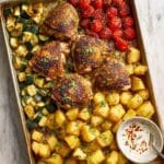 This Sheet Pan Chicken Thighs and Veggies recipe offers a delicious and easy one-pan meal featuring bone-in chicken thighs seasoned with a blend of chili powder, thyme, herbs de Provence, lemon pepper, and garlic. Roasted alongside zucchini, cherry tomatoes, and potatoes tossed in olive oil, the dish is baked to perfection, resulting in juicy chicken and tender, flavorful vegetables. Garnished optionally with Parmesan cheese, it’s a hearty and satisfying dinner perfect for busy weeknights.