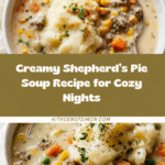 Shepherd’s Pie Soup is a comforting and hearty dish that combines the creamy texture of mashed potatoes with savory ground beef and mixed vegetables in a rich, cheesy broth. Inspired by the classic shepherd’s pie, this soup version offers a velvety, flavorful meal perfect for cozy dinners.