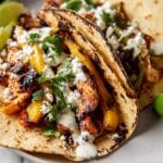 Two soft tacos lie side by side on a white plate over a white marbled surface. Each taco has a warm, charred flour tortilla folded around bright layers. The first layer has grilled chicken pieces with a golden-brown color, mixed with grilled yellow bell pepper slices and specks of black char. On top of the chicken, there is a drizzle of light creamy sauce. Fresh green cilantro leaves are scattered above, along with white crumbled cheese adding a crumbly texture throughout. Lime wedges in the background add a fresh accent to the warm tones of the dish. photo taken with an iphone --ar 4:5 --v 7