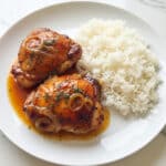 A white round plate holds two pieces of glazed chicken thighs at the left side, covered in shiny, sticky orange-brown sauce with small bits of herbs and caramelized onions scattered on top. The chicken skin looks crispy and golden with some darker caramel spots. On the right side of the plate, there is a mound of plain white rice with soft, fluffy grains. The plate is set on a white marbled surface. Photo taken with an iphone --ar 4:5 --v 7