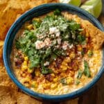 7. Serve: Serve the smoky street corn queso warm with a bowl of your favorite tortilla chips for dipping. Enjoy this crowd-pleasing appetizer at any gathering!