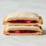 The image shows two toaster pastries on a white marbled surface, one stacked on top of the other. Each pastry has two main layers of a light golden-brown crust, with a visible layer of red fruit filling sandwiched between them. The top crust is covered with a smooth, white icing that is glossy and sprinkled with coarse sugar crystals. The texture of the crust looks slightly crumbly with a soft and thick edge. Photo taken with an iphone --ar 4:5 --v 7