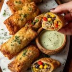 These Southwest Eggrolls are a deliciously crispy appetizer packed with a flavorful filling of bell peppers, black beans, corn, seasoned chicken, and melty cheeses. Served with a tangy, creamy Southwest Ranch dipping sauce, they bring a perfect balance of smoky, spicy, and fresh flavors. Ideal for parties or casual meals, these eggrolls are deep-fried to golden perfection for a satisfying crunch.