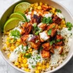 Keywords: Street corn bowl, chicken rice bowl, Mexican street corn, easy dinner, quick chicken recipe, weeknight meal