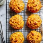 Six round orange biscuits with a rough, slightly cracked surface and a soft texture rest on a black cooling rack. The biscuits show small visible pieces inside, giving a chunky look. The cooling rack sits on a white marbled surface with a silver wire whisk and a metal measuring cup nearby. The lighting is bright and clear, highlighting the warm color and fluffy texture of the biscuits. photo taken with an iphone --ar 4:5 --v 7