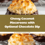 These coconut macaroons are chewy, sweet, and perfectly toasted treats made with sweetened coconut flakes, condensed milk, and whipped egg whites for a light texture. Optionally dipped in rich dark chocolate, they are an irresistible dessert perfect for any occasion.