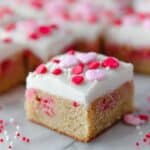 - Decorate: Sprinkle the remaining ¼ cup Valentine sprinkles and candy hearts or red M&Ms evenly over the frosted bars to complete the festive look.