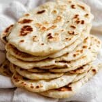 A pile of seven layered flatbreads with a light beige color and slightly charred brown spots, stacked on a white cloth on a white marbled surface; the flatbreads have uneven round shapes with soft, puffy textures showing some folds and bubbles. Photo taken with an iphone --ar 4:5 --v 7