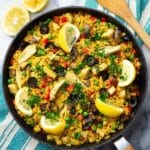 - Garnish and serve: Remove from heat and sprinkle the paella with fresh chopped parsley. Serve with lemon slices on the side to squeeze over the dish for a bright finishing touch.